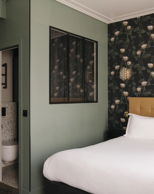 Sobre aux tons vert et beige, cette chambre est baignée de lumière provenant de la célèbre avenue bosquet. Fréquentée aussi bien par des professionnels que par des voyageurs, cette chambre tournée vers la ville a été pensée pour accueillir familles ou amis. Conçue pour 2 personnes, elle peut être rendue communicante avec un autre logement, offrant ainsi à ses occupants à la fois quiétude et proximité.