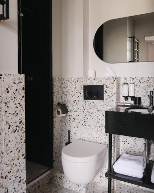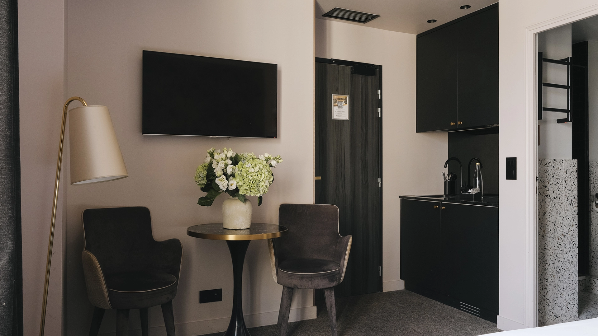 Facing the peaceful Impasse de la Vierge, this room is secluded and quiet. Thoughtfully furnished with subtle elegance, it includes a fully equipped kitchen for added independence, and a walk-in rain shower. A cozy space, perfect for feeling at home during a Parisian escape. The soft pink tones invite you to fully relax and unwind.