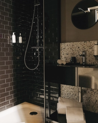 Facing the peaceful Impasse de la Vierge, this room is secluded and quiet. Thoughtfully furnished with subtle elegance, it includes a fully equipped kitchen for added independence, and a walk-in rain shower. A cozy space, perfect for feeling at home during a Parisian escape. The soft pink tones invite you to fully relax and unwind.