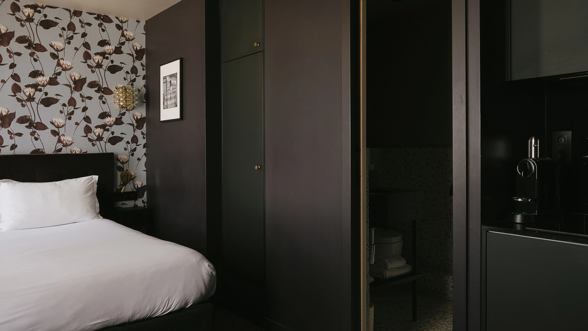 Facing the peaceful Impasse de la Vierge, this room is secluded and quiet. Thoughtfully furnished with subtle elegance, it includes a fully equipped kitchen for added independence, and a walk-in rain shower. A cozy space, perfect for feeling at home during a Parisian escape. The soft pink tones invite you to fully relax and unwind.